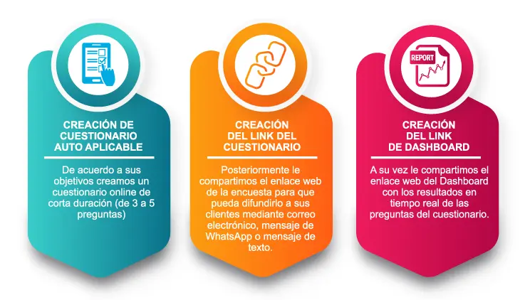 A través de nuestras plataformas webs desarrollamos encuestas virtuales auto aplicables de corta duración, para ser difundidas a sus clientes mediante el envío de un enlace web una vez que culmine la compra de un producto o servicio. En tres simples pasos usted podrá monitorear la opinión de sus clientes: