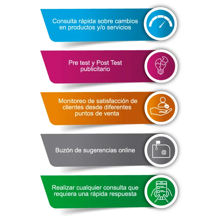 Nuestra solución le permite realizar consulta rápidas sobre diferentes puntos relacionados al proceso de atención de clientes, los productos y/o servicios que ofrece, percepción sobre cambios de marca entre otros: