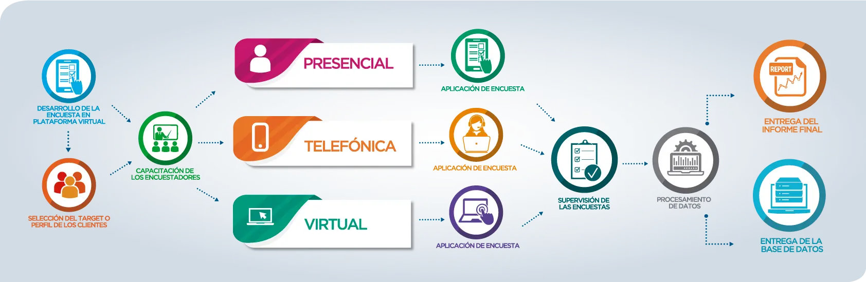 Estudio cuantitativo, inferencial y de corte transversal. Los datos son recolectados mediante la aplicación de encuestas presenciales, telefónicas o virtuales, dependiendo del público objetivo en estudio.